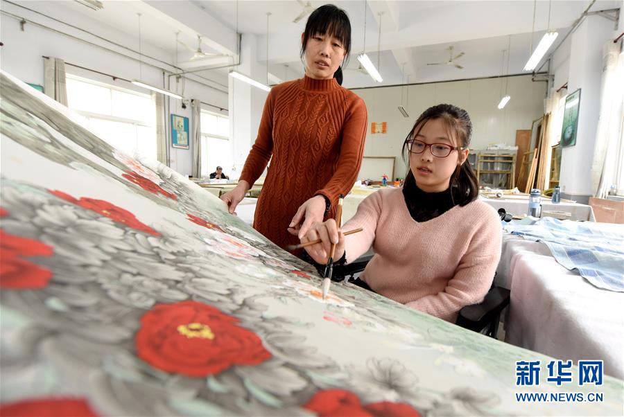 3月12日,李娜在母亲陪伴下绘制工笔画。新华社记者 朱旭东 摄
