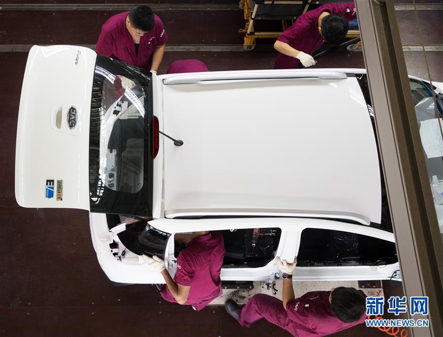 2018年8月7日,工人在安徽江淮汽车集团股份有限公司安庆分公司新能源汽车总装生产线上安装纯电动车。 新华社记者 金立旺 摄