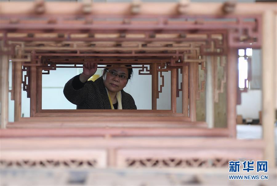 在光福镇圣恩坊红木艺术家具厂,江苏省研究员级高级工艺美术师周雪英在查看半成品的红木家具(3月13日摄)。 江苏苏州吴中区光福镇工艺雕刻历史悠久,是“苏作”“苏工”的重要发源地之一。当地的红木雕刻以造型简练、做工精良享誉海内外,主要制作各类仿古、流行红木家具及摆件,品种多达1300余种,形成了以香雪村、福利村、邓尉村为中心的红木雕刻产业片区。目前,该产业经营户75户,从业人员1400余人,有非遗传承人10多人。 新华社记者 季春鹏 摄
