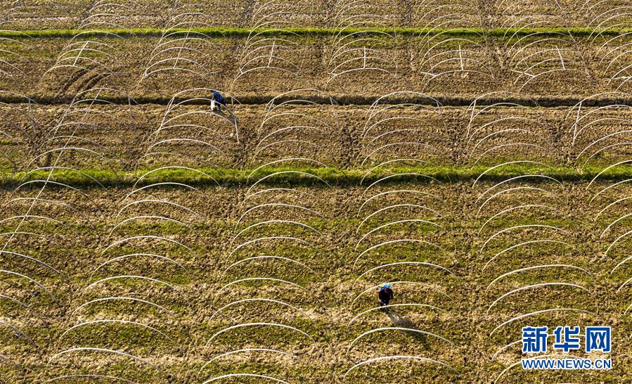 3月14日,江西省新余市渝水区人和乡三山村农民在地里除草(无人机拍摄)。 新华社发(赵春亮 摄)