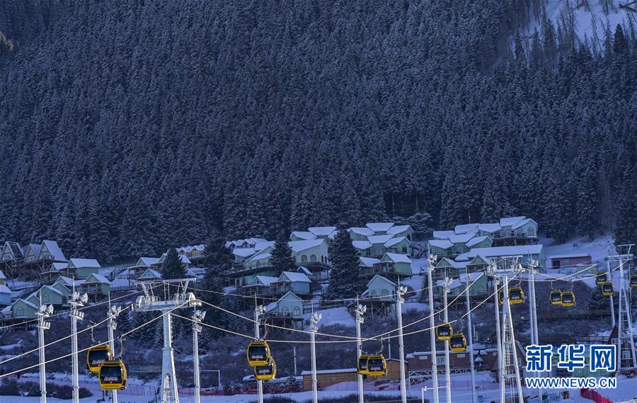 在乌鲁木齐市南郊的丝绸之路国际滑雪场,滑雪爱好者乘缆车前往高级雪道滑雪(2月7日摄)。