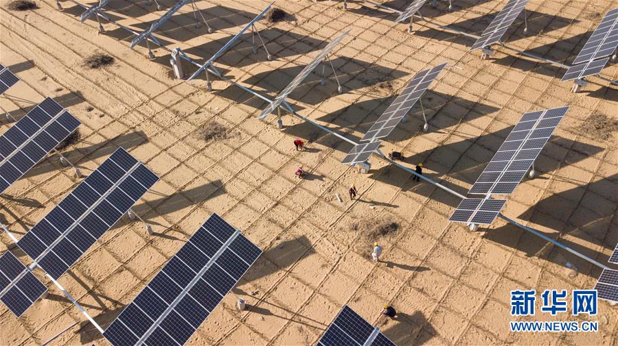 3月13日,在位于库布其沙漠腹地的达拉特光伏发电应用领跑基地,工人在插柳条打沙障(无人机拍摄)。 新华社记者 彭源 摄