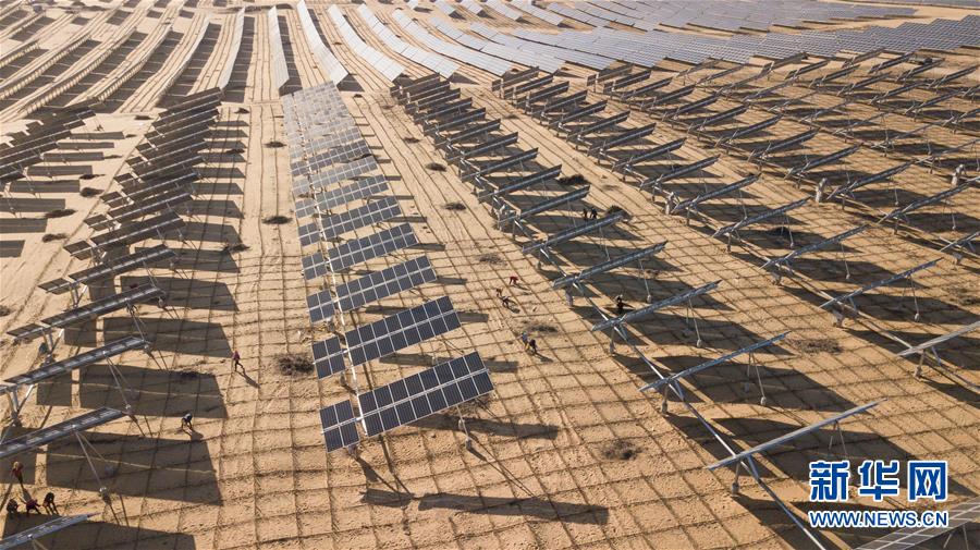 3月13日,在位于库布其沙漠腹地的达拉特光伏发电应用领跑基地,工人在插柳条打沙障(无人机拍摄)。 新华社记者 彭源 摄
