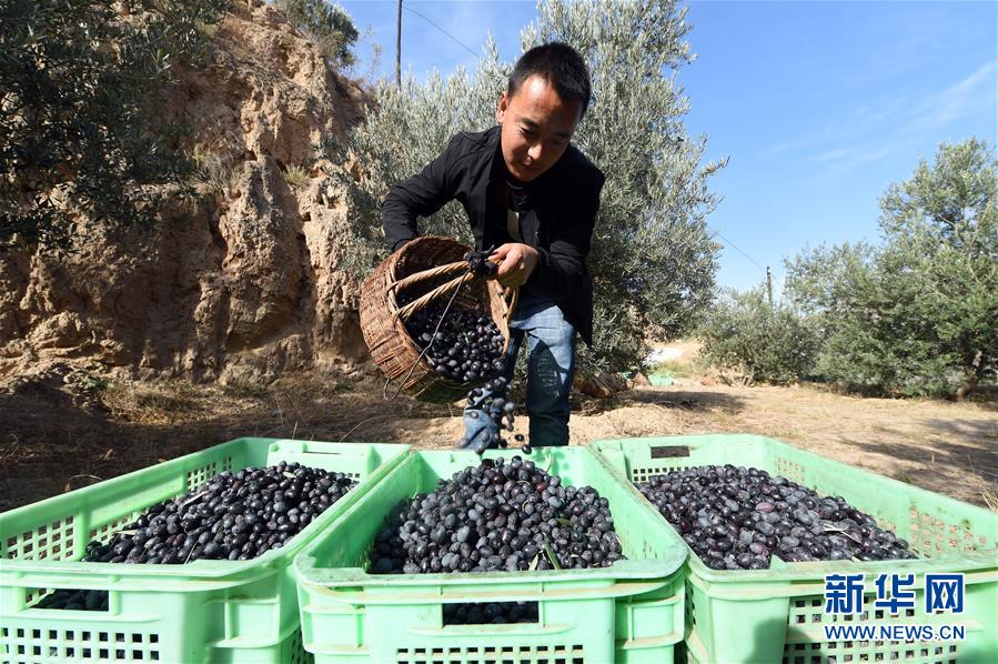 在甘肃省陇南市武都区汉王镇,一名男子将采摘的油橄榄倒入收纳箱(2018年10月30日摄)。新华社记者 范培珅 摄
