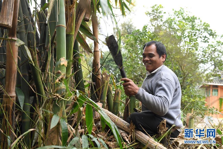 3月14日,在三江侗族自治县良口乡产口村长冲屯,李善平在砍竹子准备扛回家喂竹鼠。新华社记者 陆波岸 摄