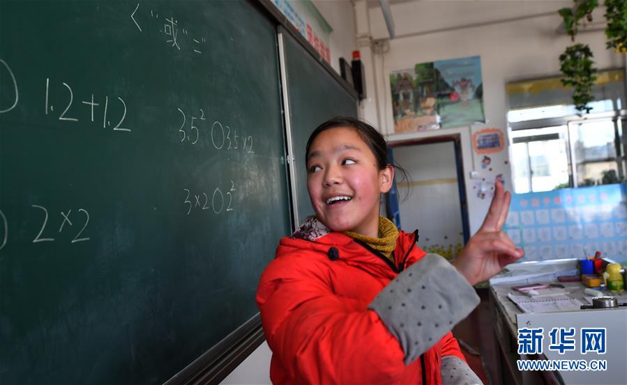 3月14日,藏族学生达娃卓玛用手语答题。 新华社记者 觉果 摄