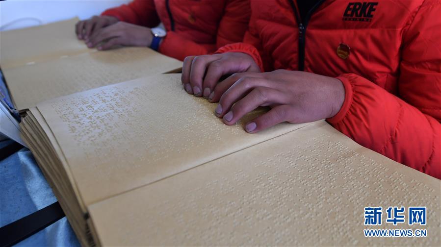 3月14日,两名学生在读盲文书。 新华社记者 觉果 摄