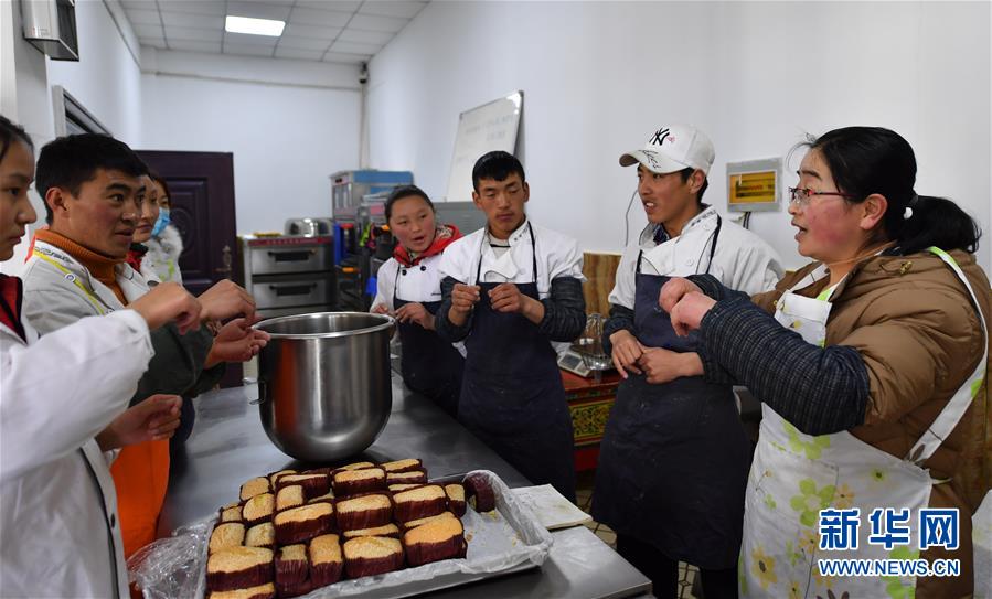 3月14日,王凤娟老师(右一)在给孩子们上烘焙课。 新华社记者 觉果 摄