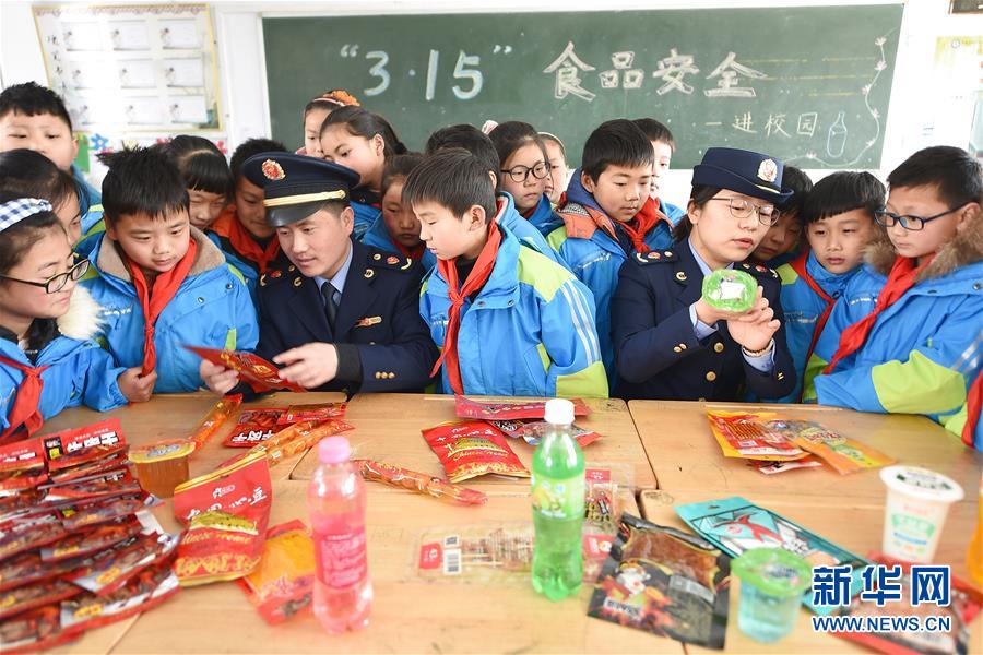 3月14日,江苏省连云港市东海县市场监督管理局执法人员在黄川镇中心小学为学生讲解如何辨别假冒伪劣食品。 “3·15”国际消费者权益日来临之际,各地举办形式多样的活动,维护消费者合法权益,提高人们的消费安全意识。 新华社发(张正友 摄)