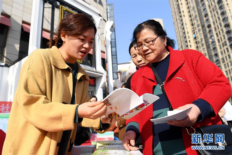 3月15日,常青街道食品安全宣传员(左)向市民宣传食品安全知识。 当日是“3·15”国际消费者权益日,安徽省合肥市包河区在常青街道举办消费者权益日主题活动,向市民宣传消费维权和鉴别假冒伪劣产品知识,维护消费者合法权益,提高人们的消费安全意识。 新华社记者刘军喜摄