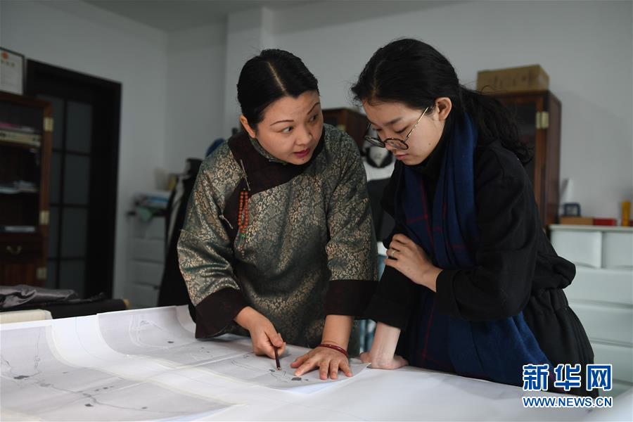 3月14日,在位于苏州吴中区光福镇的向红绣府刺绣艺术工作室,府向红在和自己的学生何梦圆(右)交流设计方案。新华社记者 季春鹏 摄