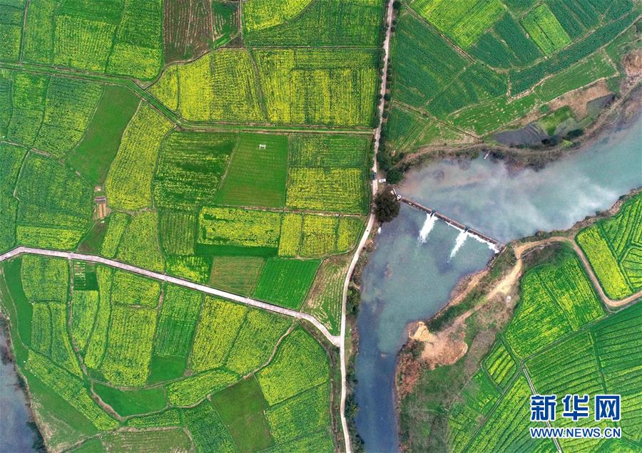3月15日拍摄的江西省萍乡市湘东区东桥镇的油菜花田一景(无人机拍摄)。 随着天气转暖,赣西地区大片油菜陆续开花,美不胜收,吸引周边地区的游客前往观赏游玩。 新华社记者 彭昭之 摄
