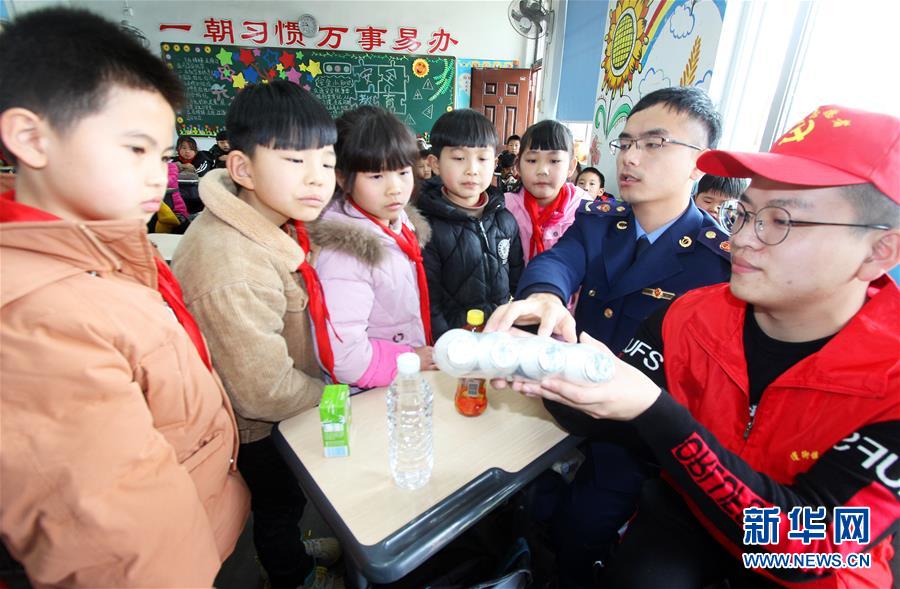 3月15日,浙江省台州市路桥区蓬街镇浦南小学,市场监督管理人员和党员志愿者正在向学生宣传食品保质期的认识方法。新华社发(蒋友亲 摄)