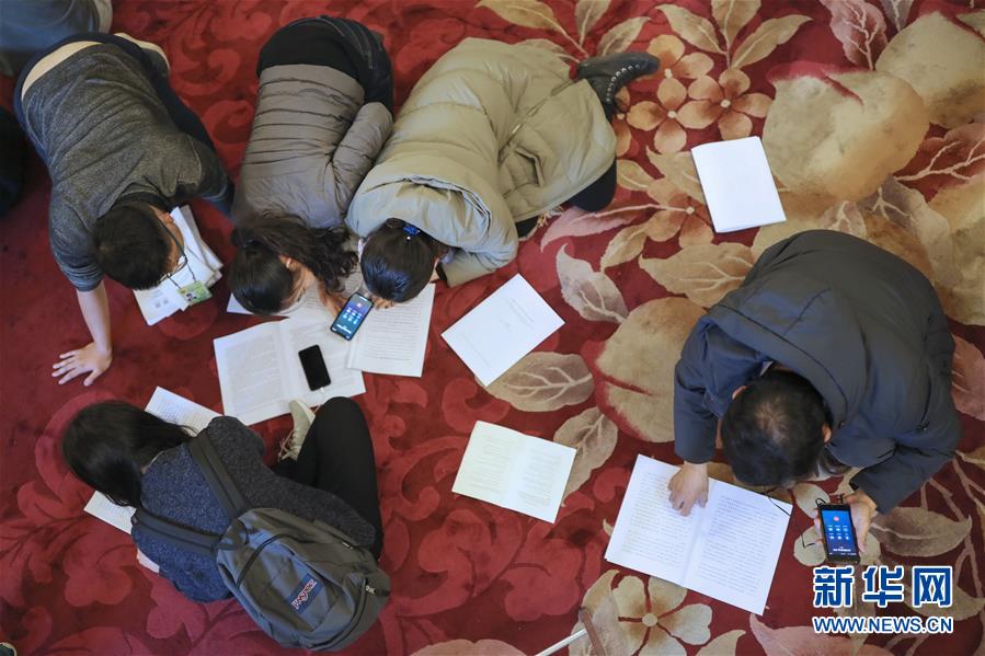 3月5日,十三届全国人大二次会议在北京人民大会堂开幕。媒体记者拿到大会资料后抢发稿件。新华社记者 兰红光 摄