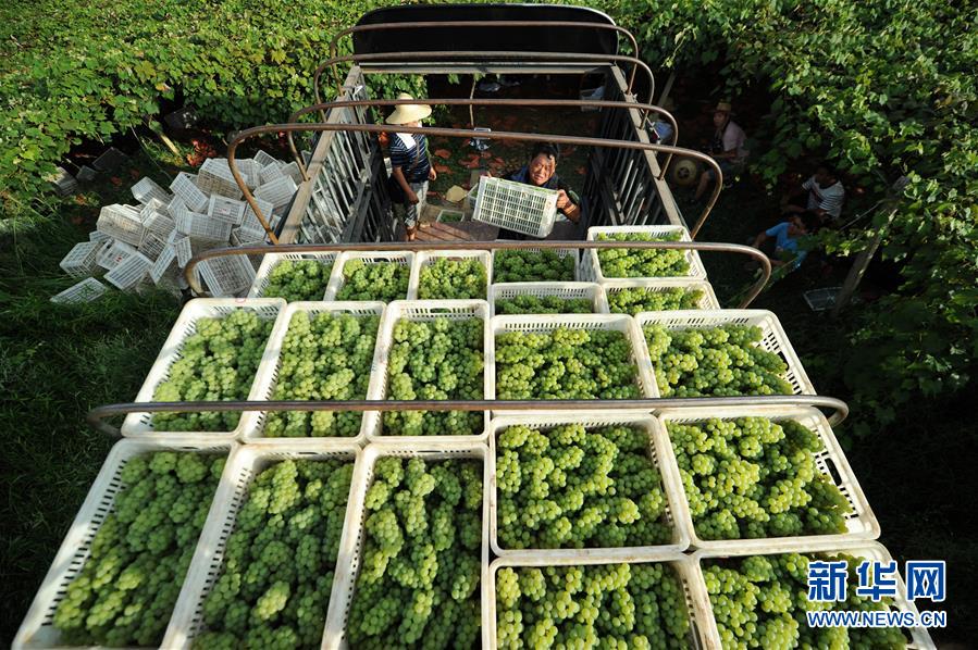 收购商在贵州省玉屏县新店生态葡萄现代农业园区收购水晶葡萄(2018年7月30日摄)。新华社记者 杨文斌 摄