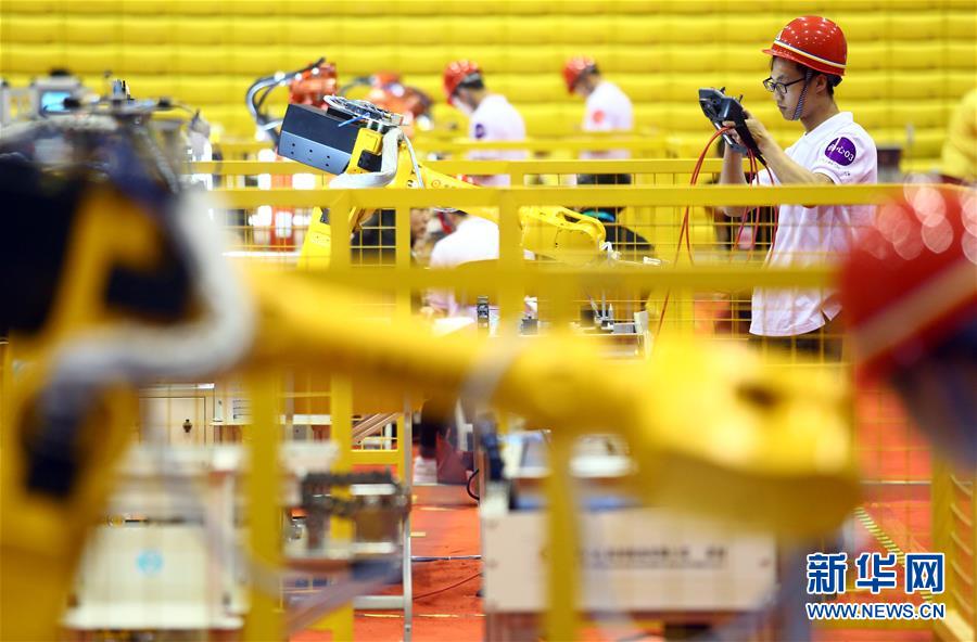 在天津现代职业技术学院,选手参加天津赛区高职组工业机器人技术应用项目比赛(2018年5月6日摄)。新华社发(刘东岳 摄)