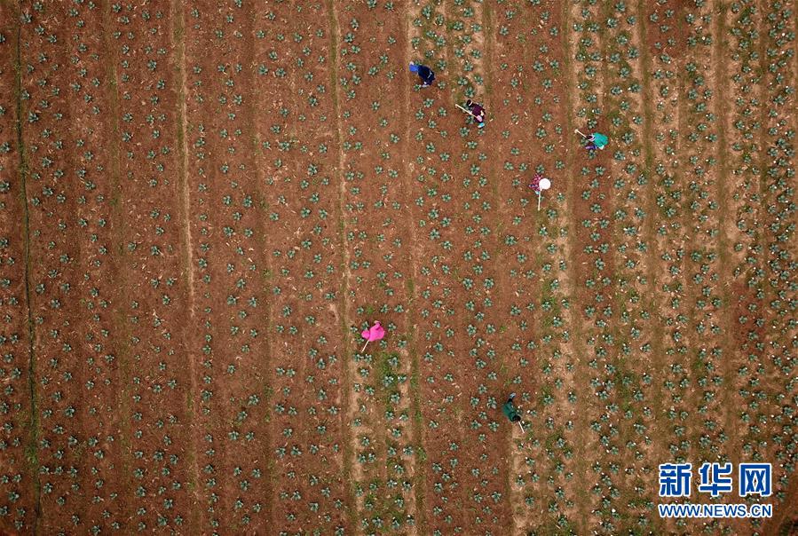 3月15日,在贵州省黔东南苗族侗族自治州丹寨县扬武镇干河村,农民在西兰花地里松土(无人机拍摄)。 新华社发(黄晓海 摄)