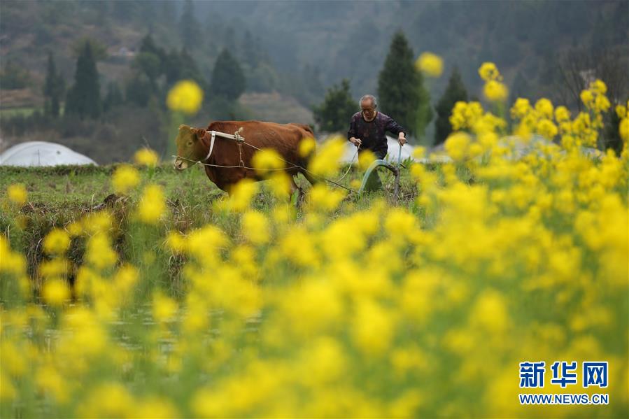 3月16日,贵州省黔东南苗族侗族自治州丹寨县兴仁镇摆泥村的农民在犁地松土。春光美好,田间地头随处可见农民们勤劳的身影。新华社发(黄晓海 摄)