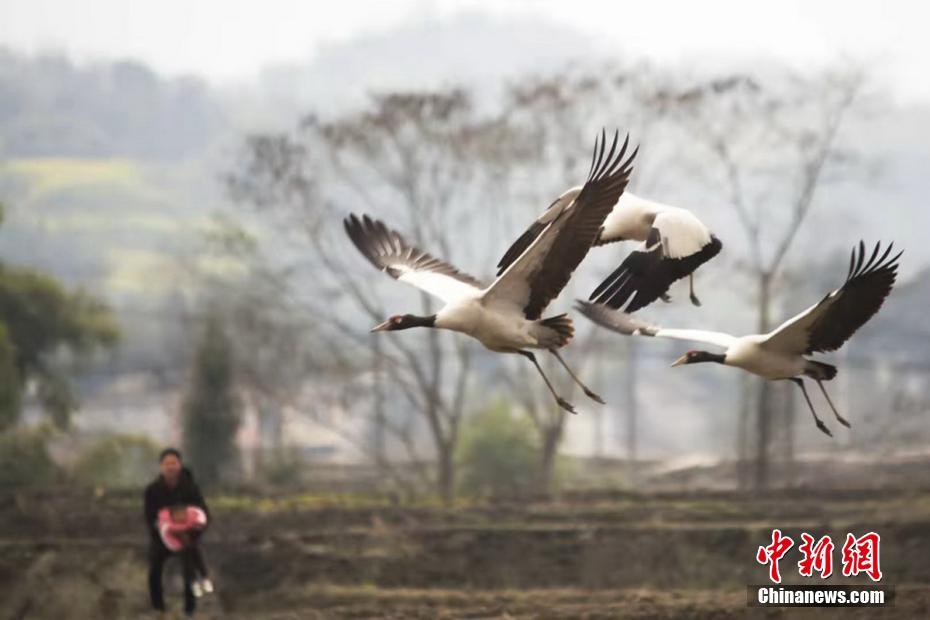 四川天全黑颈鹤群翩翩起舞 悠闲自得