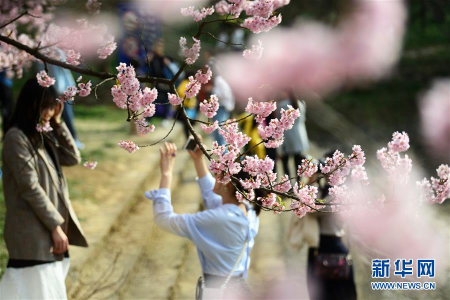 3月16日,游人在南京中山植物园赏樱拍照。 春光美好,人们纷纷走进大自然,拥抱春天。 新华社发(王跃武 摄)