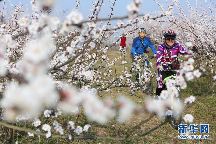 3月16日,游人在湖北省襄阳市尹集乡肖冲村杏园里骑行。 春光美好,人们纷纷走进大自然,拥抱春天。 新华社发(杨东 摄)