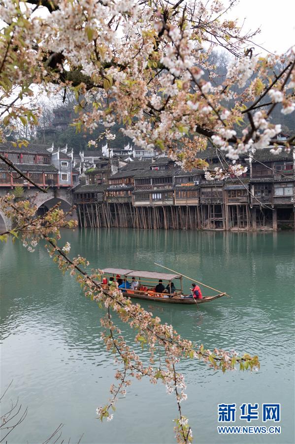 3月16日,游人在湖南省湘西土家族苗族自治州凤凰古城沱江河上泛舟游览。 春光美好,人们纷纷走进大自然,拥抱春天。 新华社发(刘振军 摄)