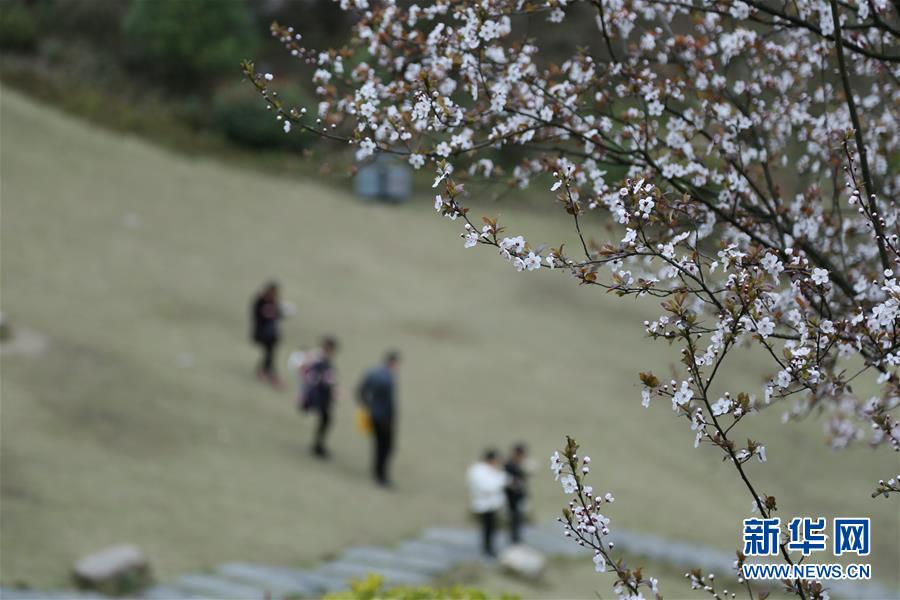 3月16日,在贵州省黔南布依族苗族自治州都匀市青云湖森林公园,市民在盛开的樱花树下踏青赏花。 春光美好,人们纷纷走进大自然,拥抱春天。 新华社发(肖伟 摄)