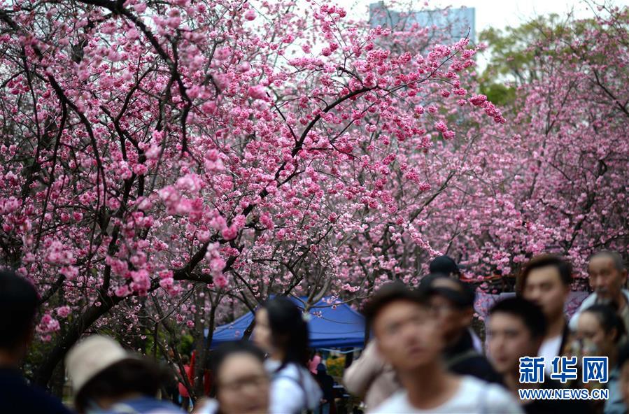 游人在昆明圆通山公园观赏盛开的樱花(3月16日摄)。 近日,云南省昆明市迎来樱花盛开的时节。昆明圆通山公园的数千株樱花灿烂绽放,吸引了市民和游客前来观花赏景。 新华社记者 秦晴 摄
