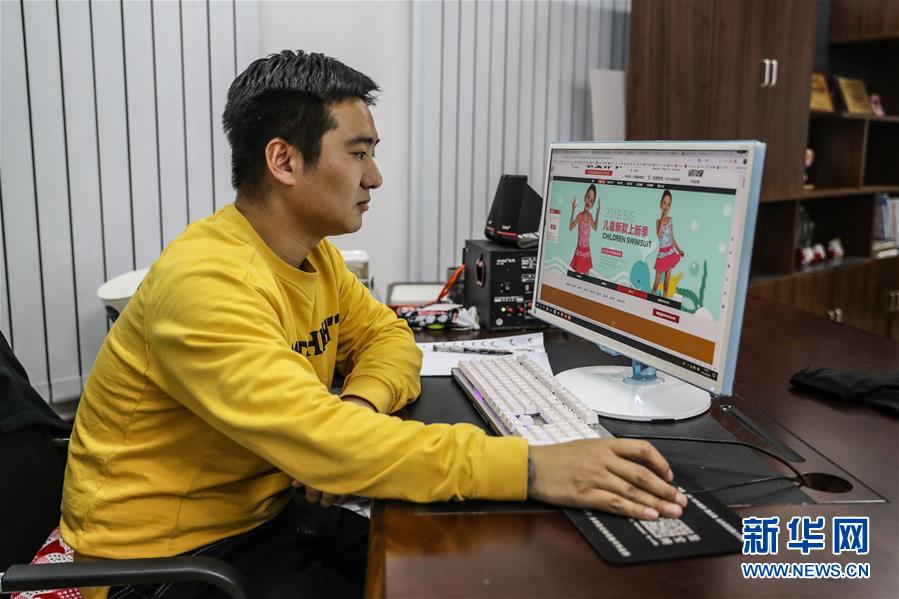 3月5日,兴城市歌曼泳衣有限公司总经理彭伟在查看网店销售情况。新华社记者 潘昱龙 摄