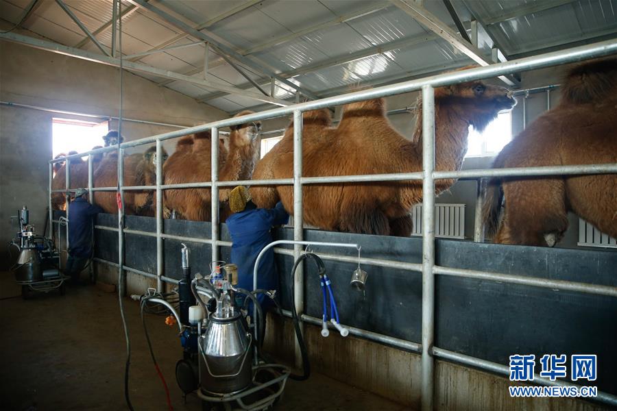工人在阿拉善右旗阿拉腾敖包镇驼乡涌泉驼奶奶源示范基地挤驼奶(3月13日摄)。这里的原奶供给于内蒙古沙漠之神生物科技有限公司生产驼奶产品。新华社记者 虞东升 摄