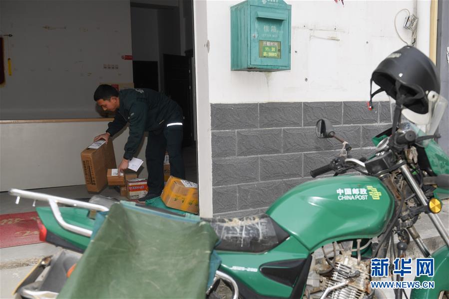 储选明在岳西县和平邮政代办所整理需要投递的包裹(3月15日摄)。 新华社记者 张端 摄