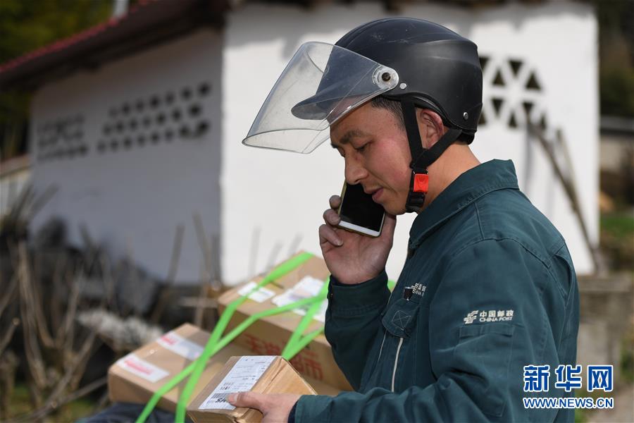 在岳西县和平乡,储选明在联系村民(3月15日摄)。 新华社记者 张端 摄