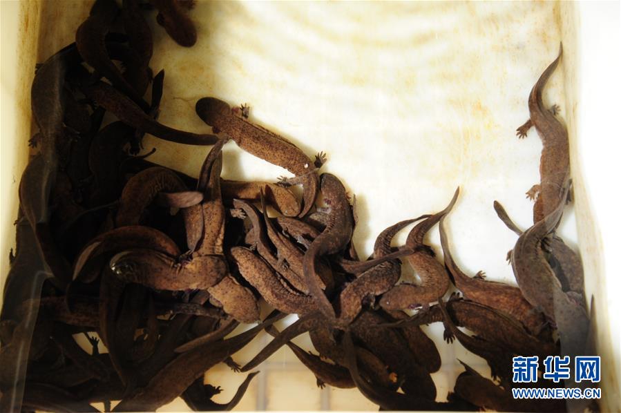 这是湖南省大鲵救护中心利用获救的野生娃娃鱼繁育的子一代娃娃鱼苗(3月16日摄)。 新华社记者 明星 摄