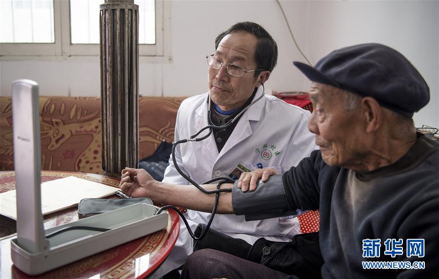 巴山镇石坝子村村医余国民(左)为杨春孝老人上门服务(2018年11月19日摄)。