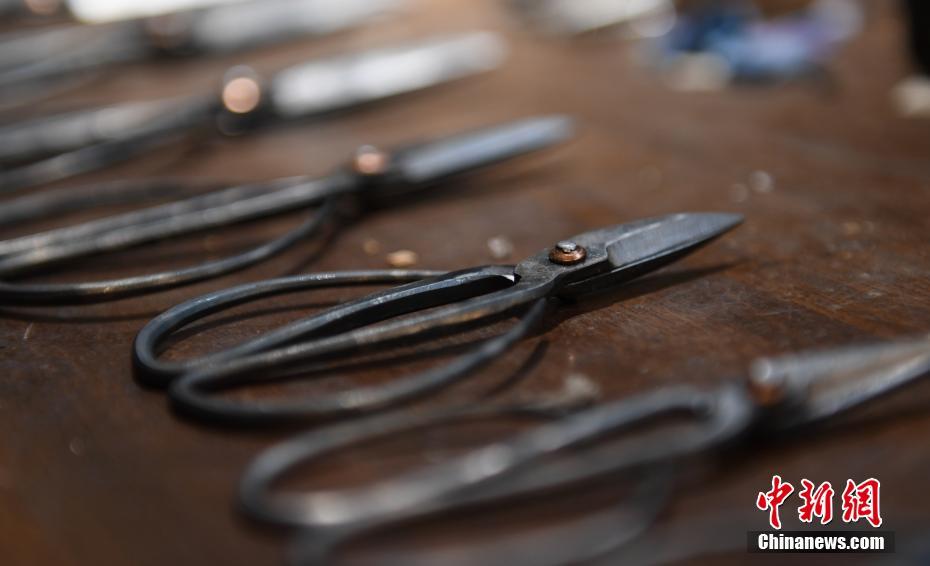 3月18日,浙江杭州,丁纪灿展示打磨出的各种样式剪刀。张小泉剪刀锻制技艺是中国国家级非遗项目之一,其传承人丁纪灿40年来恪守数十道手工锻造工艺,传承和保护传统手工技艺。中新社记者 王刚 摄