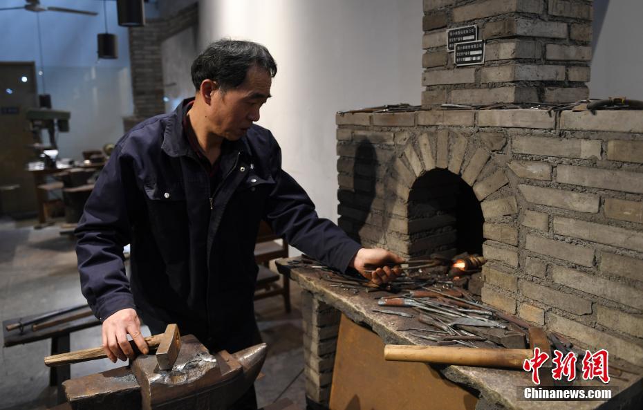 3月18日,浙江杭州,丁纪灿在加热剪刀部件。张小泉剪刀锻制技艺是中国国家级非遗项目之一,其传承人丁纪灿40年来恪守数十道手工锻造工艺,传承和保护传统手工技艺。中新社记者 王刚 摄