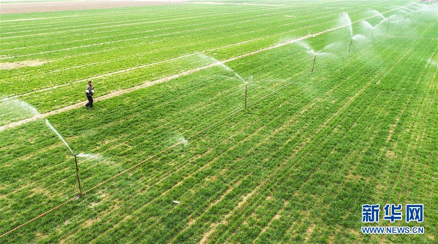 3月19日,河北省枣强县新屯镇西黄甫村农民使用喷灌设备灌溉麦田(无人机拍摄)。 随着天气逐渐转暖,春耕备播和田间管理进入关键时期,河北省枣强县农民和农业科技人员抢抓农时,积极进行麦田管理工作。 新华社记者李晓果摄
