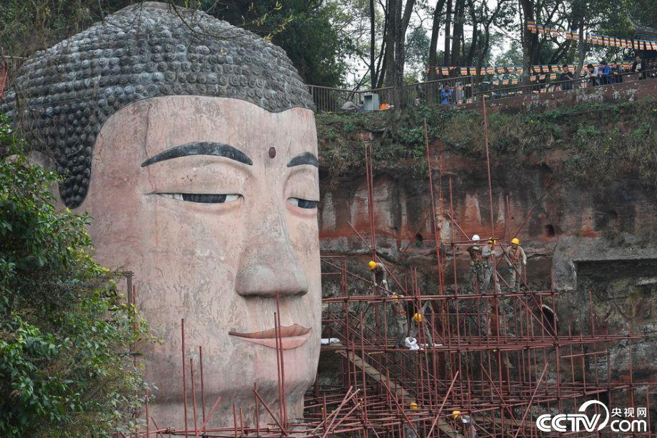 2019年3月19日,四川乐山大佛景区,10多名工人来回穿梭于脚手架间,一边“脱下”大佛颈部脚手架上的绿色防护网,一边拆除头部右侧及颈部的脚手架。截至下午,乐山大佛肩部以上的部位已全部露出。重新“露脸”的乐山大佛已不再“花脸”。在“体检”过程中,工作人员找到了此前大佛额头及两侧脸颊黑斑的“元凶”——生物病害,即主要是地衣、苔藓等生物藻类、霉菌造成的。