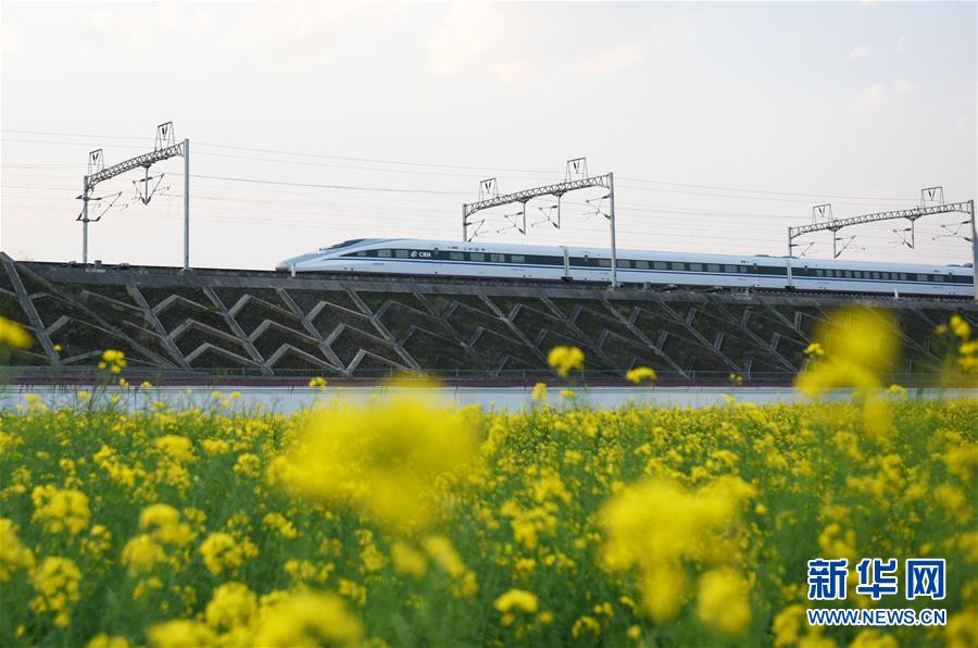 3月20日,一列动车组列车在沪昆高铁贵州关岭段行驶。 春分将至,贵州省安顺市关岭县境内的油菜花陆续开放,动车组列车穿行其间,美不胜收。 新华社记者 杨文斌 摄