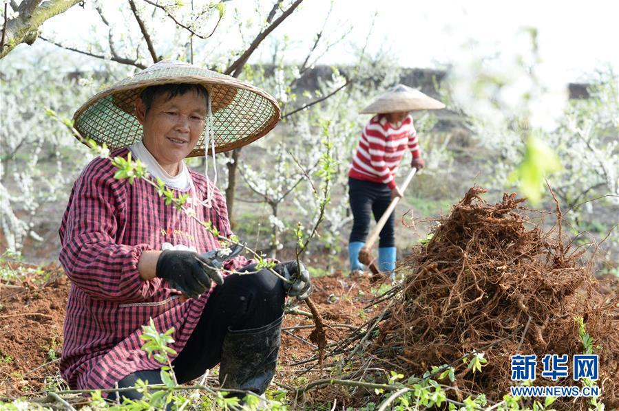 3月21日,在贵州省铜仁市玉屏侗族自治县朱家场镇混寨村黄金李基地,村民在翻地、剪枝。当日是二十四节气中的春分,全国多地农业生产进入春季繁忙时节。 新华社记者杨楹摄