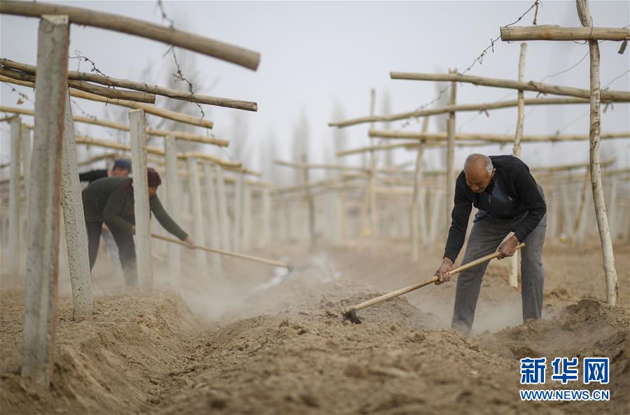 在新疆吐鲁番市高昌区胜金乡木日吐克村一处葡萄田里,农民卡哈尔·肉孜(右)把葡萄藤从地里面翻出来(3月20日摄)。时下正值吐鲁番葡萄开墩季节,当地农民将埋于地下过冬的葡萄藤翻出并搭上葡萄架。3月21日是二十四节气中的春分,全国多地农业生产进入春季繁忙时节。 新华社记者赵戈摄
