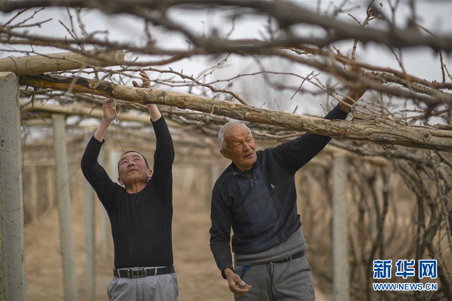 在新疆吐鲁番市高昌区胜金乡木日吐克村一处葡萄田里,农民卡哈尔·肉孜(右)和力提普·马合木提把葡萄藤固定在架子上(3月20日摄)。时下正值吐鲁番葡萄开墩季节,当地农民将埋于地下过冬的葡萄藤翻出并搭上葡萄架。3月21日是二十四节气中的春分,全国多地农业生产进入春季繁忙时节。 新华社记者赵戈摄