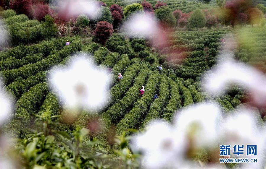 3月21日,江西省宜春市靖安县仁首镇周口村农民在茶园里采茶。 当日是二十四节气中的春分,各地农民抢抓农时积极做好农田管理。 新华社发(徐仲庭 摄)
