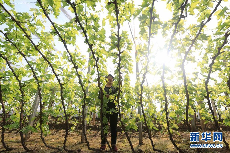 3月21日,河北省唐山市海港经济开发区王滩镇赵滩村农民在大棚内对葡萄进行管理。 当日是二十四节气中的春分,各地农民抢抓农时积极做好农田管理。 新华社发(李磊 摄)