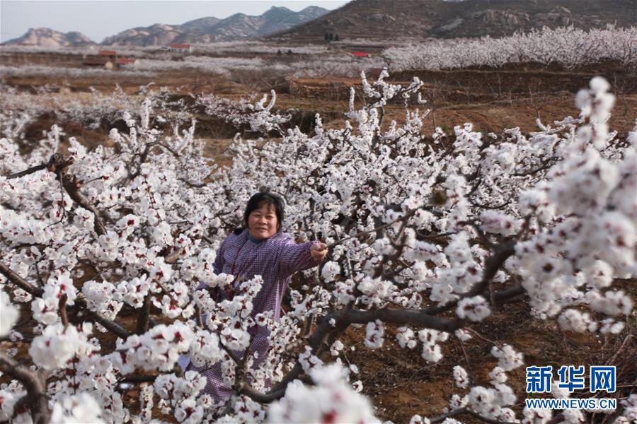 3月21日,山东省费县大田庄乡周庄村农民在为杏花授粉。 当日是二十四节气中的春分,各地农民抢抓农时积极做好农田管理。 新华社发(武纪全 摄)