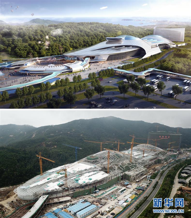 拼版照片:上图为珠海长隆海洋科学馆设计效果图(新华社发);下图为3月21日无人机拍摄的建设中的珠海长隆海洋科学馆(新华社记者梁旭摄) 近日,由中建三局一公司承建的珠海长隆海洋科学馆现已进入装饰装修阶段,预计于年内完工。项目总建筑面积约40万平方米,集动物展览、动物生活环境展示、动物科普教育、珍稀动物繁育等功能于一体。 新华社发