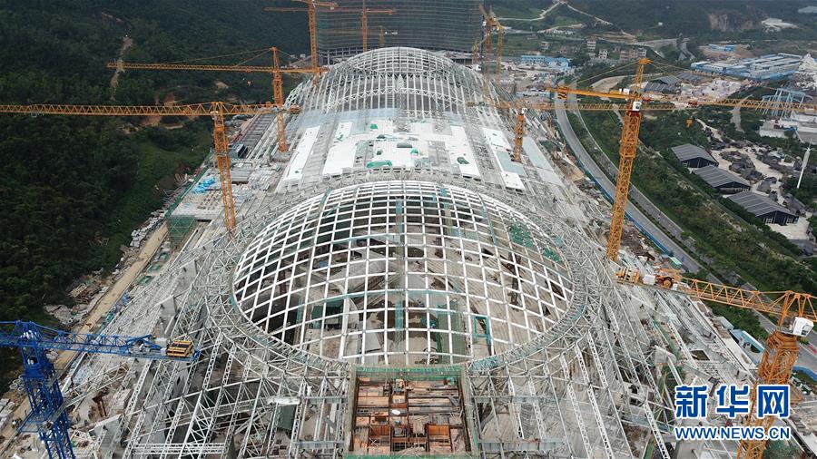建设中的珠海长隆海洋科学馆(3月21日无人机拍摄)。 近日,由中建三局一公司承建的珠海长隆海洋科学馆现已进入装饰装修阶段,预计于年内完工。项目总建筑面积约40万平方米,集动物展览、动物生活环境展示、动物科普教育、珍稀动物繁育等功能于一体。 新华社记者 梁旭 摄