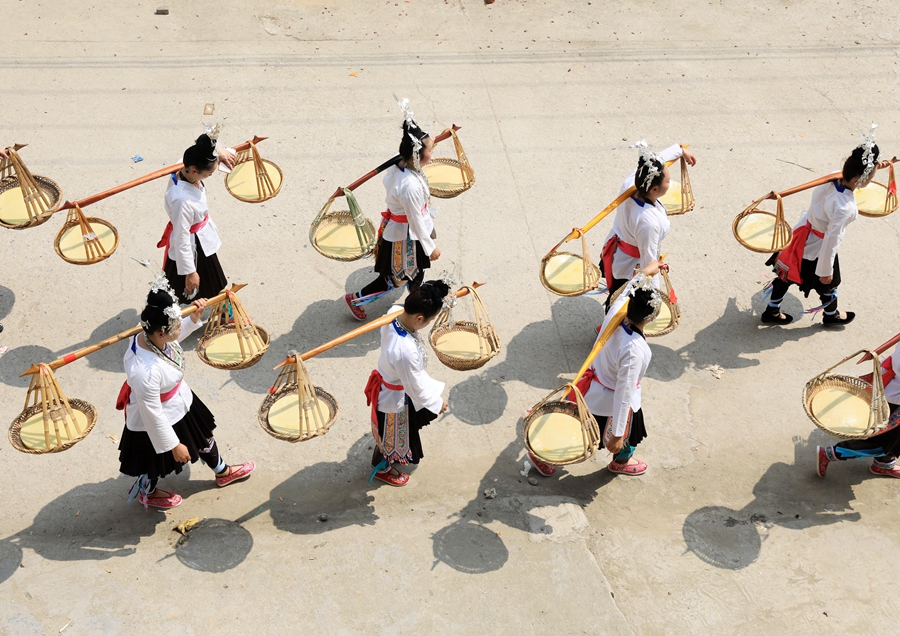 3月21日,在贵州省黎平县龙额镇龙额侗寨,村民挑着“社粑”参加盛装巡游。新华社发(杨代富 摄)