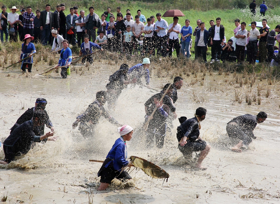3月21日,在贵州省黎平县龙额镇龙额侗寨,村民在稻田里捞“社鱼”。新华社发(杨帆 摄)