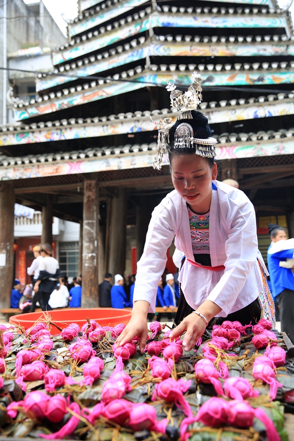 3月21日,在贵州省黎平县龙额镇龙额侗寨,村民在摆放“社饭”。新华社发(杨成利 摄)